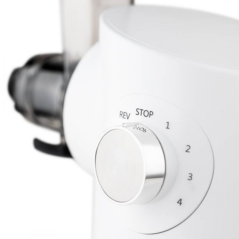 O motor avançado permitiu introduzir talvez a característica mais revolucionária do Sana 727 Supreme: controlo de velocidade variável. A maioria dos espremedores lentos opera de 43 a 110 rpm. O Sana 727 oferece quatro configurações de velocidade: 40, 65, 90 e 120 rpm. Velocidades mais baixas permitem uma extracção de sumo mais suave e precisa, minimizando a espuma e a oxidação, e são especialmente boas para produtos macios ou fibrosos. Velocidades mais altas são ótimas para produtos com pouca fibra e alto teor de líquidos, como frutas cítricas. A alta velocidade também economiza muito tempo com a extração de óleo ao usar o acessório extrator de óleo opcional.
